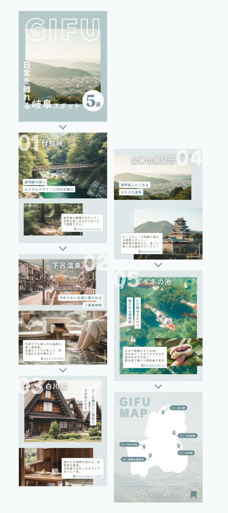 スポット紹介のページでは、メインの風景とそこで体験できることの2枚構成にしており、楽しみ方を添えることでより自分事化しやすくしています。