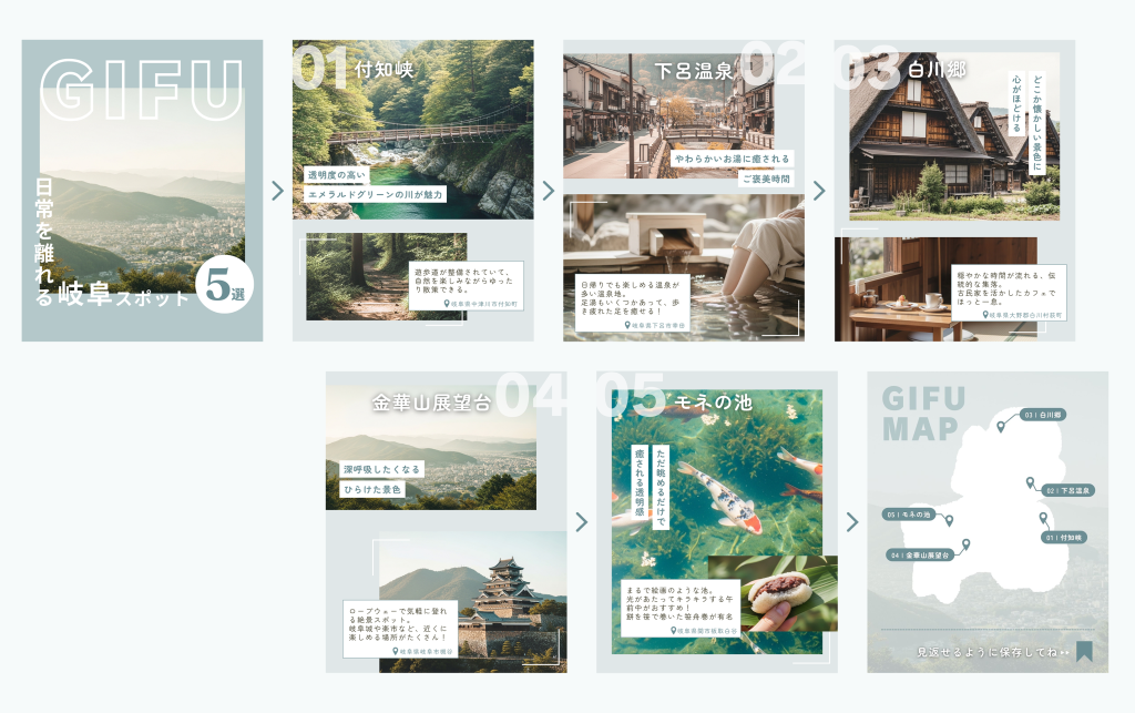 癒しやリラックスを求めて旅行先を選ぶターゲットに刺さるよう、自然の美しさをメインにしたスポットで構成しています。