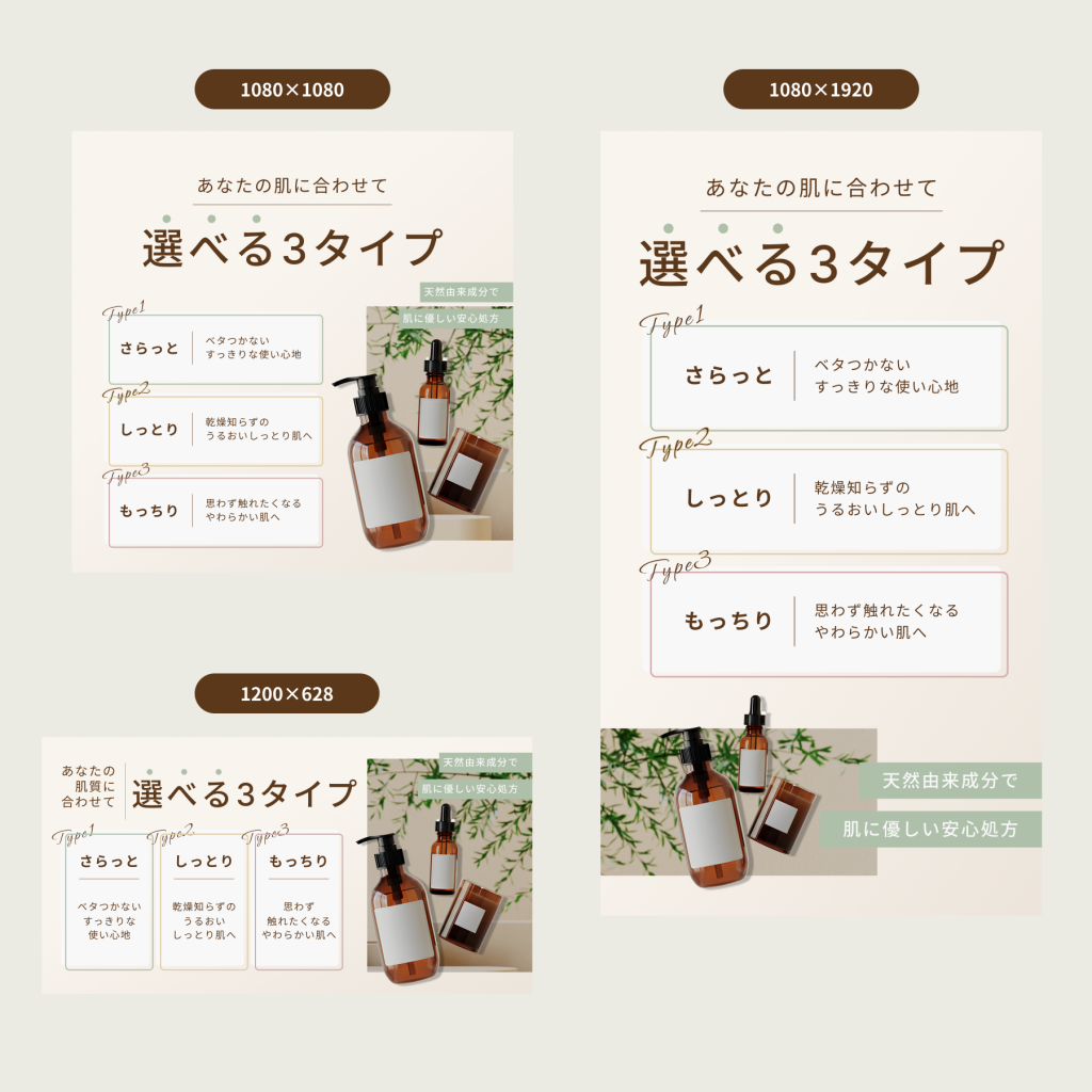 肌質に合った商品が見つかること、肌に優しいことなど、強みが伝わるようなレイアウトにしています。